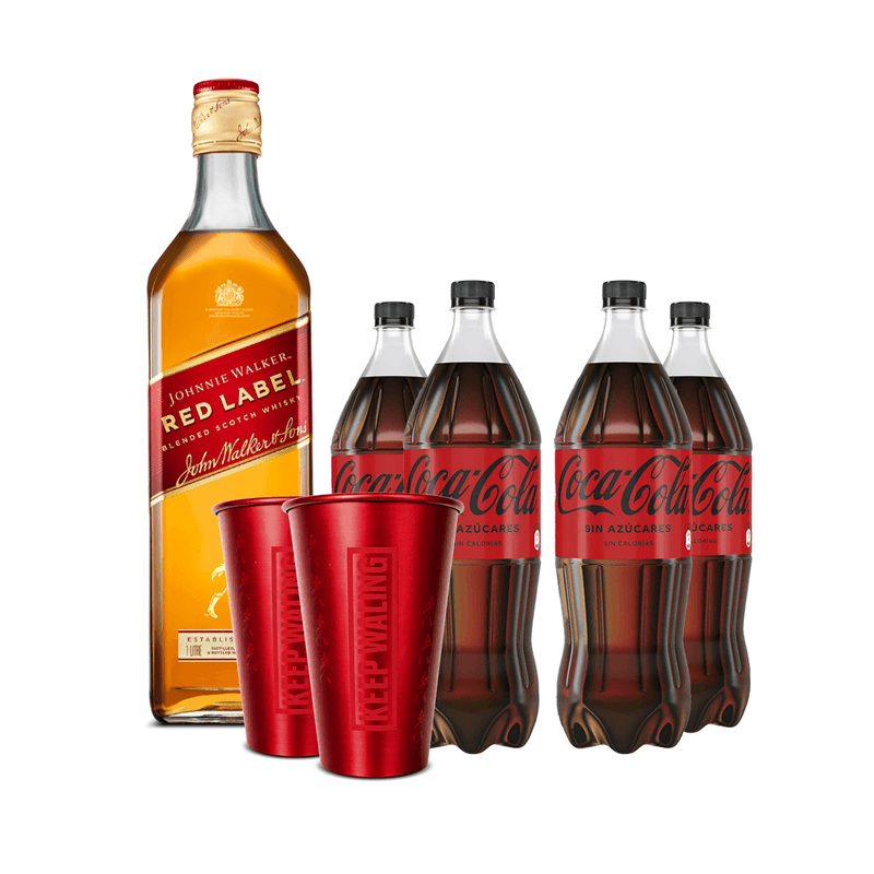 Combo Pack Coca-Cola sin azúcar 1.5L + 1 Johnnie Walker Red Label 1L + 2 vasos Johnnie Walker